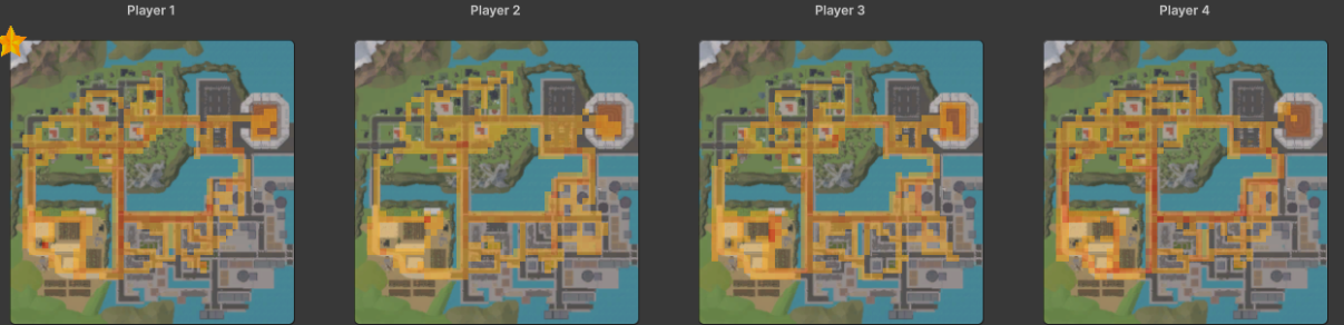 Using the logged position data, I created heatmaps showing where players actually drove across the map. These visualizations helped us identify high-traffic areas and dead zones, allowing us to tweak the map layout, nerfing overly dominant hotspots and making underused areas more attractive.